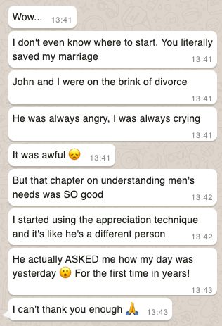 I was skeptical at first because I felt like literally nothing could change my husbands behavior, but I was wrong... the strategies in this guide have honestly changed everything! My husband and I are communicating better than ever. He's more involved with the kids, helps around the house, and shows me appreciation. I feel respected and cherished again. Our marriage has completely turned around. I'm eternally grateful!